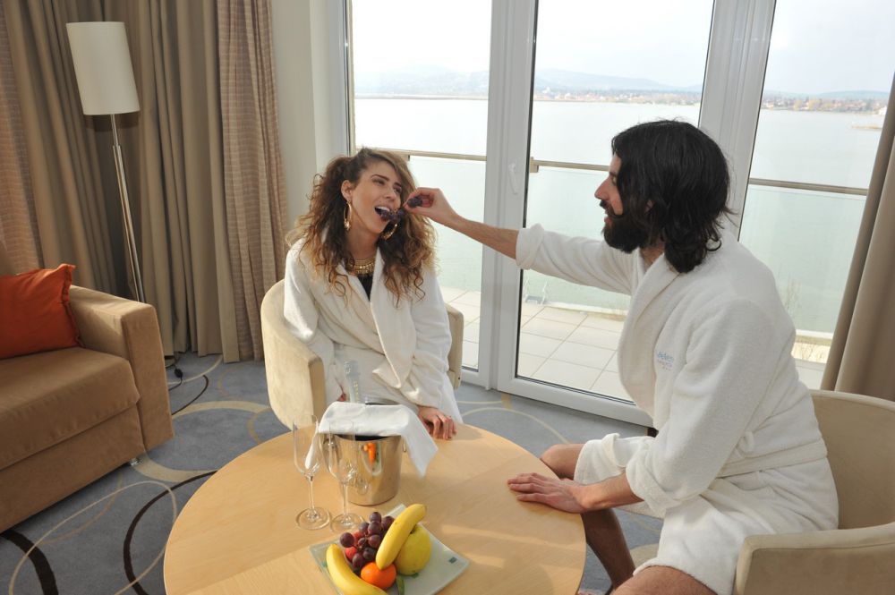Már beesteledett, mire beértek a szállodába, így a romantika adott volt. A Prémium szárny teraszáról figyelték a Balatont, majd Bebe kibérelte Katának az egész wellness részleget, ahol kettesben lehettek.